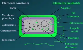 En tant que procaryote (organisme sans noyau), les bactéries sont des cellules relativement simples, caractérisées par une absence de noyau et d’organites comme les mitochondries et les chloroplastes, elles n'ont pas non plus de réticulum endoplasmique ou d'appareil de Golgi[46].