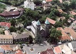 Le basalte extrait du mont était acheminé par wagonnet jusqu'à une installation de concassage située sur la rive du lac. Les vibrations causées par ces installations provoquèrent des fissures dans l'église Saint-Émeric construite en 1344 sur la colline de l'église, rendant l'édifice dangereux. Elle fut remplacée en 1931–1932 par une nouvelle église de style néo-roman, construite en pierre de basalte selon les plans de Gáspár Fábián, sous l'épiscopat de Nándor Rott et sous le pastorat de Sándor Varga. Ce projet fut financé par le Fonds des cultes.