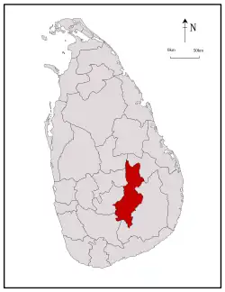 Il est limitrophe, au nord-est, du district d'Ampara (province de l'Est), à l'est et au sud du district de Moneragala (province d'Uva), au sud-ouest, du district de Ratnapura (dans la province de Sabaragamuwa), à l'ouest des districts de Nuwara Eliya, Kandy et Matale (tous trois dans la province du Centre).