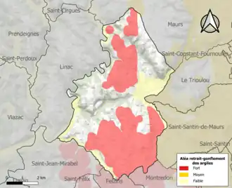 Le retrait-gonflement des sols argileux est susceptible d'engendrer des dommages importants aux bâtiments en cas d’alternance de périodes de sécheresse et de pluie. 44,8 % de la superficie communale est en aléa moyen ou fort (67,7 % au niveau départemental et 48,5 % au niveau national). Sur les 757 bâtiments dénombrés sur la commune en 2019, 289 sont en aléa moyen ou fort, soit 38 %, à comparer aux 72 % au niveau départemental et 54 % au niveau national. Une cartographie de l'exposition du territoire national au retrait gonflement des sols argileux est disponible sur le site du BRGM[18],[Carte 2].