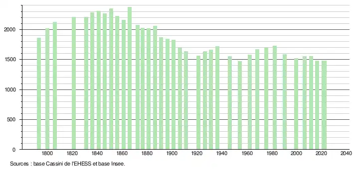 L'évolution du nombre d'habitants est connue à travers les recensements de la population effectués dans la commune depuis 1793. Pour les communes de moins de 10 000 habitants, une enquête de recensement portant sur toute la population est réalisée tous les cinq ans, les populations de référence des années intermédiaires étant quant à elles estimées par interpolation ou extrapolation[27]. Pour la commune, le premier recensement exhaustif entrant dans le cadre du nouveau dispositif a été réalisé en 2006[28].