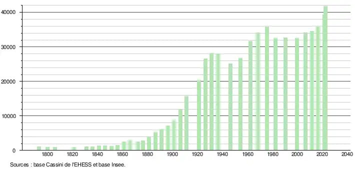 - ↑ Par convention dans Wikipédia, le principe a été retenu de n’afficher dans le tableau des recensements et le graphique, pour les populations de référence postérieures à 1999, que les populations correspondant à une enquête exhaustive de recensement pour les communes de moins de 10 000 habitants, et que les populations des années 2006, 2011, 2016, etc. pour les communes de plus de 10 000 habitants, ainsi que la dernière population de référence publiée par l’Insee pour l'ensemble des communes.