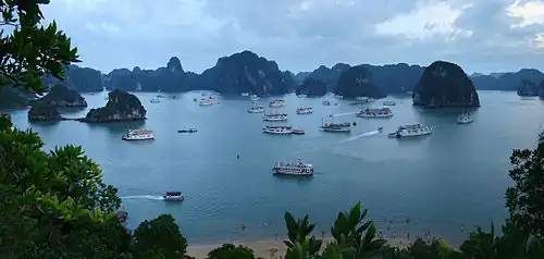 La baie de Ha Long, baie de Halong ou baie d'Along[1],[2] (la notation baie d'Along tend à disparaître), (en vietnamien : Vịnh Hạ Long, litt. « descente du dragon »)[3] est une vaste baie naturelle d'eau marine de la mer de Chine méridionale. D'une superficie de plus de 43 000 hectares (1 500 km2, le plus grand karst marin du monde[4]), la baie est située à l'est de Hạ Long et à l'est-nord-est de l’île de Cat Ba, dans le golfe du Tonkin. Elle dépend administrativement de la province de Quảng Ninh dans le Nord du Vietnam, à la frontière chinoise.
