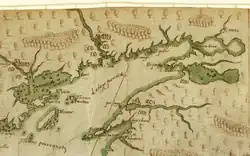 La carte à gauche montre la première délimitation approfondie de la Nouvelle-Angleterre et des côtes canadiennes. Ce détail montre Port-Royal ; la baie Françoise (de Fundy), l'île longue. Les noms des lieux et la ligne côtière correspondent de très près aux récits de Champlain dans ses Voyages, publiés en 1613. Champlain conçut personnellement et dessina la carte. Champlain fonda ce travail entièrement sur ses propres travaux d'exploration et d'observation, incluant ses entretiens avec des Indiens (sauvages), ainsi que sur ses propres calculs. La carte montre des habitations le long de la côte, à la fois des établissements français et des villages indiens. Les symboles de colline indiquent des élévations visibles de la côte. Les hauts-fonds dangereux sont indiqués comme des groupes de petits points, et les ancres représentent des endroits où il jeta l'ancre. Il s'agit d'un des grands trésors cartographiques d'Amérique.