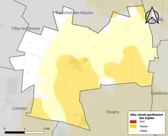 Le retrait-gonflement des sols argileux est susceptible d'engendrer des dommages importants aux bâtiments en cas d’alternance de périodes de sécheresse et de pluie. 35,3 % de la superficie communale est en aléa moyen ou fort (52,8 % au niveau départemental et 48,5 % au niveau national). Sur les 116 bâtiments dénombrés sur la commune en 2019, 99 sont en aléa moyen ou fort, soit 85 %, à comparer aux 70 % au niveau départemental et 54 % au niveau national. Une cartographie de l'exposition du territoire national au retrait gonflement des sols argileux est disponible sur le site du BRGM[25],[26].