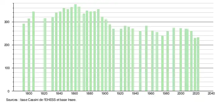 L'évolution du nombre d'habitants est connue à travers les recensements de la population effectués dans la commune depuis 1793. Pour les communes de moins de 10 000 habitants, une enquête de recensement portant sur toute la population est réalisée tous les cinq ans, les populations de référence des années intermédiaires étant quant à elles estimées par interpolation ou extrapolation[27]. Pour la commune, le premier recensement exhaustif entrant dans le cadre du nouveau dispositif a été réalisé en 2008[28].