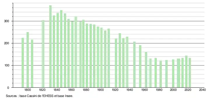L'évolution du nombre d'habitants est connue à travers les recensements de la population effectués dans la commune depuis 1793. Pour les communes de moins de 10 000 habitants, une enquête de recensement portant sur toute la population est réalisée tous les cinq ans, les populations de référence des années intermédiaires étant quant à elles estimées par interpolation ou extrapolation[16]. Pour la commune, le premier recensement exhaustif entrant dans le cadre du nouveau dispositif a été réalisé en 2007[17].