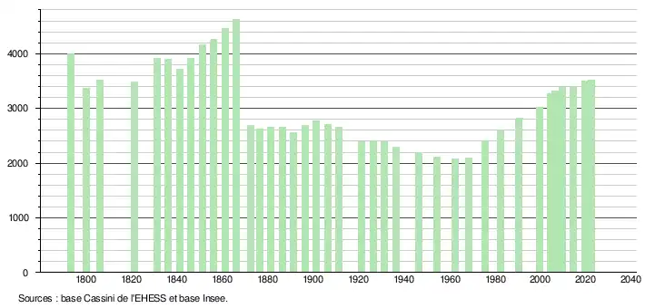 L'évolution du nombre d'habitants est connue à travers les recensements de la population effectués dans la commune depuis 1793. Pour les communes de moins de 10 000 habitants, une enquête de recensement portant sur toute la population est réalisée tous les cinq ans, les populations de référence des années intermédiaires étant quant à elles estimées par interpolation ou extrapolation[30]. Pour la commune, le premier recensement exhaustif entrant dans le cadre du nouveau dispositif a été réalisé en 2004[31].
