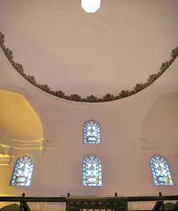 Les murs extérieurs sont construits en rangées alternant pierre de taille et briques. Le vestiaire de la section des hommes a quatre vitraux en arc brisé au-dessus de la façade et le vestiaire des femmes a trois fenêtres.