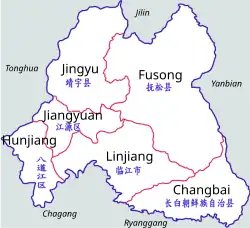 La ville-préfecture de Baishan exerce sa juridiction sur six subdivisions - deux districts, une ville-district, deux xian et un xian autonome :