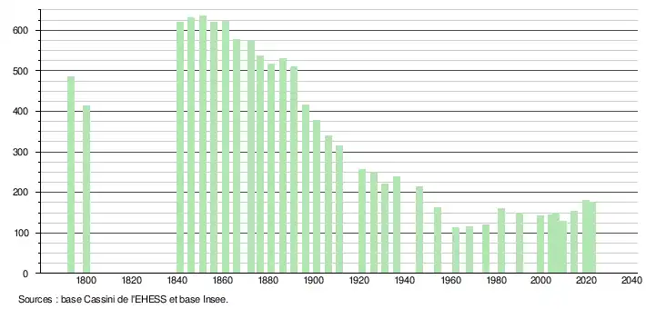 L'évolution du nombre d'habitants est connue à travers les recensements de la population effectués dans la commune depuis 1793. Pour les communes de moins de 10 000 habitants, une enquête de recensement portant sur toute la population est réalisée tous les cinq ans, les populations de référence des années intermédiaires étant quant à elles estimées par interpolation ou extrapolation[46]. Pour la commune, le premier recensement exhaustif entrant dans le cadre du nouveau dispositif a été réalisé en 2004[47].