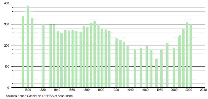 L'évolution du nombre d'habitants est connue à travers les recensements de la population effectués dans la commune depuis 1793. Pour les communes de moins de 10 000 habitants, une enquête de recensement portant sur toute la population est réalisée tous les cinq ans, les populations de référence des années intermédiaires étant quant à elles estimées par interpolation ou extrapolation[15]. Pour la commune, le premier recensement exhaustif entrant dans le cadre du nouveau dispositif a été réalisé en 2007[16].