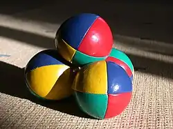 La jonglerie aux balles regroupe celle des ballons (plus gros) et des sacs à grains, ce qui montre que la forme de l’objet n’est pas toujours forcément parfaitement sphérique.