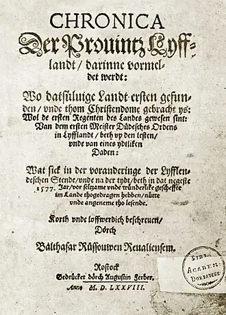 Balthasar Russow rédige en bas allemand une chronique historique, la Chronica der Provinz Lyfflandt, décrivant l'histoire de la Livonie, l'Ordre Livonien et la Guerre de Livonie (1558-1583). Dans ses travaux, il dénonce l'immoralité des classes supérieures de la Livonie, les croyances superstitieuses et les traditions païennes des paysans estoniens. Il fait l'éloge de la Suède, la nouvelle puissance régionale.
