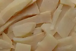 Les turions de toutes les espèces sont comestibles[15], bien que certains puissent être assez amers. Phyllostachys viridiglaucescens a un goût doux et Phyllostachys edulis fait l'objet de cultures industrielles dans ce but (sa taille étant plus grande, donc plus rentable). Les jeunes pousses sont cueillies, un peu comme des asperges, dès qu'elles commencent à sortir de terre. La plupart des espèces ne se mangent pas crues à cause de leur amertume. On les fait bouillir ou griller dans leur enveloppe, que l'on enlève ensuite, avant d'émincer le cœur des pousses pour les préparer en salade, en friture ou en sauce. Les pousses de certaines espèces (Sasa) peuvent être grillées au four et dégustées directement.