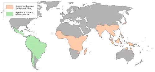 - Le second, distribué en Amérique centrale, Amérique du Sud, au Mexique et dans les Antilles, comprend 3 sous-tribus : les Arthrostylidiinae (15 genres pour 185 espèces), les Guaduinae (5 genres pour 35 espèces), et les Chusqueinae (1 genre pour 175 espèces)