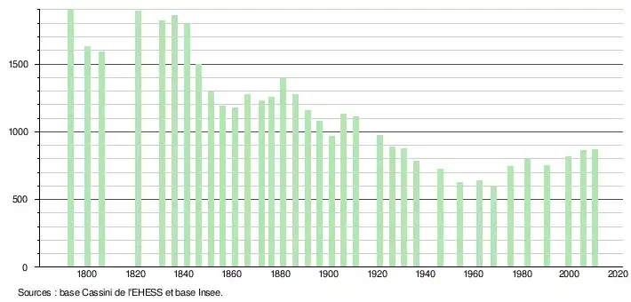 L'évolution du nombre d'habitants est connue à travers les recensements de la population effectués dans la commune depuis 1793. À partir du , les populations légales des communes sont publiées annuellement dans le cadre d'un recensement qui repose désormais sur une collecte d'information annuelle, concernant successivement tous les territoires communaux au cours d'une période de cinq ans. Pour les communes de moins de 10 000 habitants, une enquête de recensement portant sur toute la population est réalisée tous les cinq ans, les populations légales des années intermédiaires étant quant à elles estimées par interpolation ou extrapolation[10]. Pour la commune, le premier recensement exhaustif entrant dans le cadre du nouveau dispositif a été réalisé en 2005[11],[Note 1].
