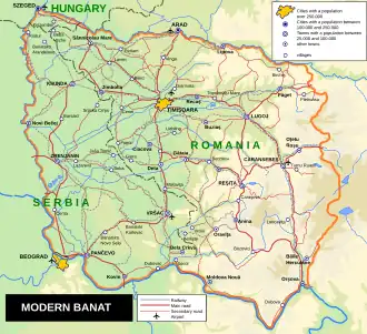 C'est la commission « Lord » où des géographes comme Robert Seton-Watson (en) ou Emmanuel de Martonne et l'historien Ernest Denis jouèrent un rôle important, qui traça la frontière entre la Roumanie et la Serbie[5] : la partie nord-est du Banat fut attribuée à la Roumanie (le Krassó-Szörény/Caraș-Severin en totalité, 2/3 du Temes/Timiș, et une petite partie du Torontál), tandis que la partie sud-ouest (le Torontál et 1/3 du Temes/Timiș) fut attribuée au royaume des Serbes, Croates et Slovènes nouvellement créé (qui deviendra la Yougoslavie). Une petite zone, ayant une population mixte (hongroise, serbe et roumaine) près de la ville de Szeged fut laissée à la Hongrie nouvellement indépendante. Le traité de Trianon de 1920 confirme ce partage de 1918, toujours en vigueur.