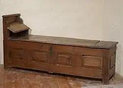 Au XIe siècle des appuis apparaissent, dans le prolongement des pieds, et une barre pour dossier[2]. Il se complète ensuite d'un coffre dans sa base : muni d'un coffre, d'un dossier et d'accotoirs, il est appelé alors archebanc[3] et banc-coffre plus tardivement.