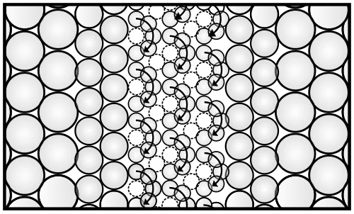 La microstructure subit alors de nombreux changements sous l'action de l'énergie libérée par la déformation. Lorsque le matériau est un métal, la taille moyenne des grains (ou cristallites) diminue jusqu'à atteindre une taille d'environ 100 nm au cœur de la bande (voir Fig. 1). Par ailleurs, des études récentes ont permis de révéler que certaines parties de la bande de cisaillement ne présentait plus une microstructure composée de grains. Ces zones ont alors les mêmes caractéristiques physiques que l'eau ou le verre. Il s'agit d'une structure amorphe comme le verre, les élastomères et les liquides.