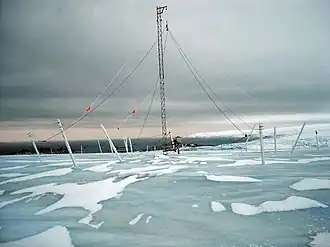 - L'antenne radioélectrique pour être efficaces est longue d'une demi-onde (de plusieurs dizaines de mètres) peut être soutenue par un cerf-volant porte antenne de type stationnaire ou par un ballon porte antenne[5] pour la réception des ondes radioélectriques.