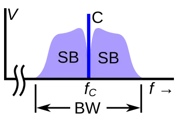 La modulation d'amplitude d'un signal porteur produit normalement deux bandes latérales en miroir. Les composantes du signal situées au-dessus de la fréquence de la porteuse constituent la bande latérale supérieure (USB) et celles situées au-dessous de la fréquence de la porteuse constituent la bande latérale inférieure (LSB). Par exemple, si une porteuse de 900 kHz est modulée en amplitude par un signal audio de 1 kHz, il y aura des composantes à 899 kHz et 901 kHz ainsi qu'à 900 kHz dans le spectre radiofréquence généré ; Ainsi, une largeur de bande audio de (disons) 7 kHz nécessitera une largeur de bande du spectre radioélectrique de 14 kHz. Dans la transmission AM conventionnelle, telle qu'elle est utilisée par les stations AM de la bande de radiodiffusion, le signal audio d'origine peut être récupéré ("détecté") par des circuits de détection synchrones ou par de simples détecteurs d'enveloppe, car la porteuse et les deux bandes latérales sont présentes. On parle parfois de modulation d'amplitude à double bande latérale (DSB-AM), mais toutes les variantes de DSB ne sont pas compatibles avec les détecteurs d'enveloppe.