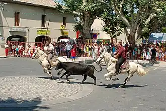 Depuis le XXe siècle, ce terme désigne une tradition taurine provençale et languedocienne consistant à simuler dans les rues fermées d’une ville ou d’un village le retour des taureaux des arènes au pré.