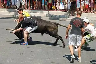 Les attrapaïres (« attrapeurs », figurant les jeunes villageois d'antan) tentent ici de capturer les taureaux par derrière en les saisissant par la queue et les cornes. Il existe des concours d'attrapaïres où un prix récompense celui qui attrape le plus de taureaux.