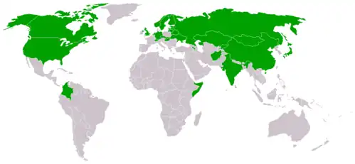 La Fédération internationale de bandy est fondée le avec la participation de quatre fédérations nationales : Union soviétique, Finlande, Suède[3] et Norvège. Un championnat du monde est mis en place à partir de 1957. Aujourd'hui, 27 fédérations nationales sont affiliées[4] :