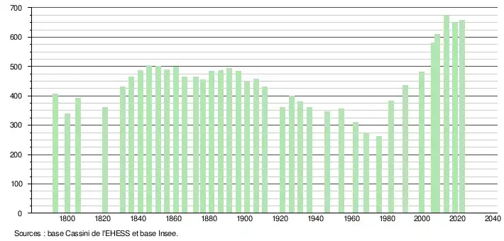 L'évolution du nombre d'habitants est connue à travers les recensements de la population effectués dans la commune depuis 1793. Pour les communes de moins de 10 000 habitants, une enquête de recensement portant sur toute la population est réalisée tous les cinq ans, les populations de référence des années intermédiaires étant quant à elles estimées par interpolation ou extrapolation[39]. Pour la commune, le premier recensement exhaustif entrant dans le cadre du nouveau dispositif a été réalisé en 2008[40].