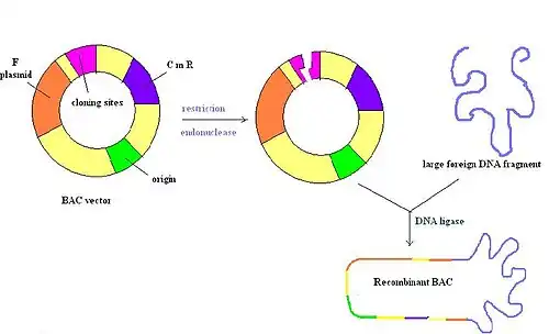 Les chromosomes artificiels bactériens (BAC) sont des molécules d'ADN circulaires, généralement d'environ 7 kb de longueur, qui sont capables de contenir des inserts jusqu'à 300 kb. Les vecteurs BAC contiennent un réplicon dérivé du facteur F d' E. coli, ce qui garantit qu'ils sont maintenus à une copie par cellule[4]. Une fois qu'un insert est ligaturé dans un BAC, celui-ci est introduit dans des souches déficientes en recombinaison d' E. coli par électroporation. La plupart des vecteurs BAC contiennent un gène de résistance aux antibiotiques et également un marqueur de sélection positive[2]. La figure de droite représente un vecteur BAC coupé avec une enzyme de restriction, suivi de l'insertion d'un ADN étranger qui est réannexé par une ligase. Dans l'ensemble, il s'agit d'un vecteur très stable, mais certains peuvent être difficiles à préparer en raison de la présence d'une seule origine de réplication, tout comme les PAC[15].