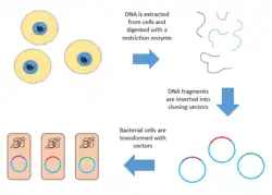 L'ADN est stocké dans une population de vecteurs identiques, chacun contenant un insert d'ADN différent. Afin de construire une banque génomique, l'ADN de l'organisme est extrait des cellules puis digéré par une enzyme de restriction pour couper l'ADN en fragments d'une taille spécifique. Les fragments sont ensuite insérés dans le vecteur à l'aide de la ligase[1]. Ensuite, le vecteur d'ADN peut être absorbé par un organisme hôte - généralement une population d'Escherichia coli ou de levure -, chaque cellule ne contenant qu'une seule molécule de vecteur. L'utilisation d'une cellule hôte pour transporter le vecteur permet de faciliter l'amplification et la récupération de clones spécifiques de la banque pour analyse[2].