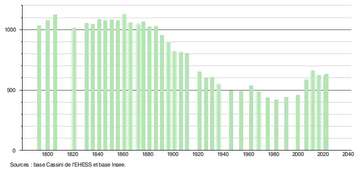 L'évolution du nombre d'habitants est connue à travers les recensements de la population effectués dans la commune depuis 1793. Pour les communes de moins de 10 000 habitants, une enquête de recensement portant sur toute la population est réalisée tous les cinq ans, les populations de référence des années intermédiaires étant quant à elles estimées par interpolation ou extrapolation[47]. Pour la commune, le premier recensement exhaustif entrant dans le cadre du nouveau dispositif a été réalisé en 2006[48].