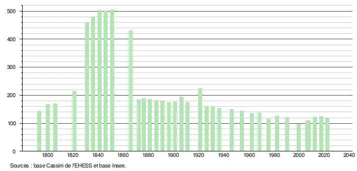L'évolution du nombre d'habitants est connue à travers les recensements de la population effectués dans la commune depuis 1793. Pour les communes de moins de 10 000 habitants, une enquête de recensement portant sur toute la population est réalisée tous les cinq ans, les populations de référence des années intermédiaires étant quant à elles estimées par interpolation ou extrapolation[19]. Pour la commune, le premier recensement exhaustif entrant dans le cadre du nouveau dispositif a été réalisé en 2007[20].