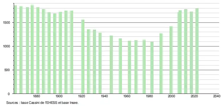 L'évolution du nombre d'habitants est connue à travers les recensements de la population effectués dans la commune depuis 1861. Pour les communes de moins de 10 000 habitants, une enquête de recensement portant sur toute la population est réalisée tous les cinq ans, les populations de référence des années intermédiaires étant quant à elles estimées par interpolation ou extrapolation[20]. Pour la commune, le premier recensement exhaustif entrant dans le cadre du nouveau dispositif a été réalisé en 2007[21].