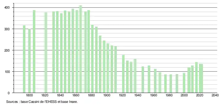 L'évolution du nombre d'habitants est connue à travers les recensements de la population effectués dans la commune depuis 1793. Pour les communes de moins de 10 000 habitants, une enquête de recensement portant sur toute la population est réalisée tous les cinq ans, les populations de référence des années intermédiaires étant quant à elles estimées par interpolation ou extrapolation[28]. Pour la commune, le premier recensement exhaustif entrant dans le cadre du nouveau dispositif a été réalisé en 2005[29].