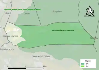Un site Natura 2000 est défini sur la commune tant au titre de la directive oiseaux, que de la directive habitats, la « haute vallée de la Garonne »[17]. Occupant une superficie de 11 134 ha, il s'agit d'une vallée profonde, marquée par l'érosion glaciaire, avec une végétation essentiellement acidiphile caractérisée par des landes à Callune, une forte étendue du manteau boisé, une présence ponctuelle de formations alpines et la présence d'Ours liée à une réintroduction expérimentale[18]. Ce site héberge une avifaune de montagne bien représentée avec bon nombre d'espèces de l'annexe I qui s'y reproduisent, parmi lesquelles sept espèces inféodées aux milieux forestiers[19].