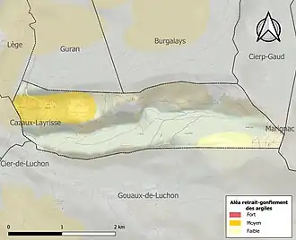 La commune est vulnérable au risque de mouvements de terrains constitué principalement du retrait-gonflement des sols argileux[29]. Cet aléa est susceptible d'engendrer des dommages importants aux bâtiments en cas d’alternance de périodes de sécheresse et de pluie. 13,1 % de la superficie communale est en aléa moyen ou fort (88,8 % au niveau départemental et 48,5 % au niveau national). Sur les 22 bâtiments dénombrés sur la commune en 2019, 22 sont en aléa moyen ou fort, soit 100 %, à comparer aux 98 % au niveau départemental et 54 % au niveau national. Une cartographie de l'exposition du territoire national au retrait gonflement des sols argileux est disponible sur le site du BRGM[30],[Carte 3].