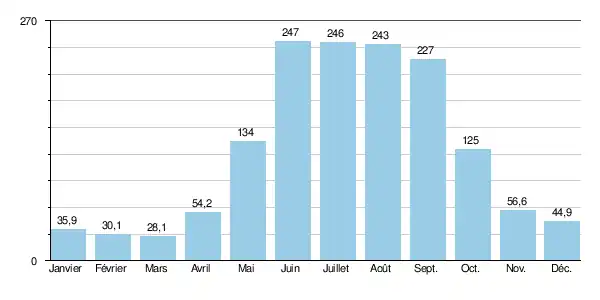 En ce qui concerne la période estivale, la plus importante car libre de glaces (de mai à octobre inclus), le débit minimal observé a été de 77,0 m3/s en septembre 1942, ce qui était, à vrai dire, encore plus que confortable[3]. Un débit mensuel estival inférieur à 80 m3/s est fort exceptionnel.