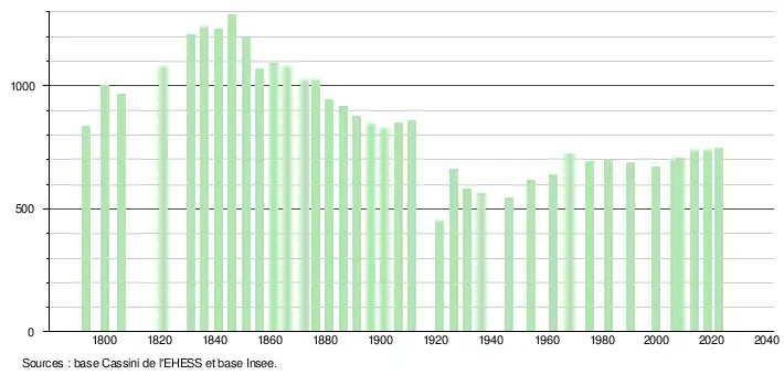 L'évolution du nombre d'habitants est connue à travers les recensements de la population effectués dans la commune depuis 1793. Pour les communes de moins de 10 000 habitants, une enquête de recensement portant sur toute la population est réalisée tous les cinq ans, les populations de référence des années intermédiaires étant quant à elles estimées par interpolation ou extrapolation[32]. Pour la commune, le premier recensement exhaustif entrant dans le cadre du nouveau dispositif a été réalisé en 2008[33].