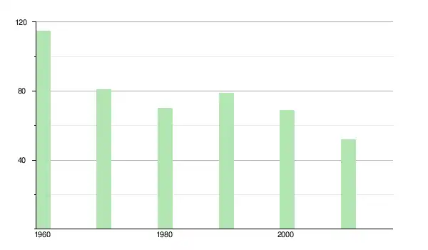 | 1980 | 70 | ▼ −13,58 % | |