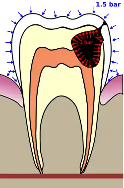 L'augmentation de la pression entraîne alors une diminution du volume de l'air contenu dans ce trou. La dent étant solide, sa paroi ne peut se modifier et la dépression creusée génère cette douleur. Parfois, bien que cela soit plus rare que lors de la phase de remontée, il peut se produire une fracture de la dent[1].
