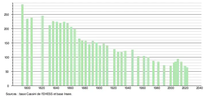 L'évolution du nombre d'habitants est connue à travers les recensements de la population effectués dans la commune depuis 1793. Pour les communes de moins de 10 000 habitants, une enquête de recensement portant sur toute la population est réalisée tous les cinq ans, les populations de référence des années intermédiaires étant quant à elles estimées par interpolation ou extrapolation[23]. Pour la commune, le premier recensement exhaustif entrant dans le cadre du nouveau dispositif a été réalisé en 2004[24].