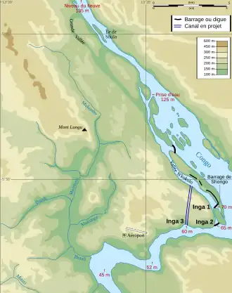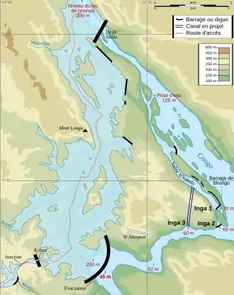 Un barrage, le barrage de Shongo, a permis de mettre sous eau le Nkokolo. L'eau est captée à 10 kilomètres en amont du site du barrage Inga II, à une altitude de 125 mètres, pour atteindre 115 mètres au niveau du bief alimentant les barrages Inga I et Inga II. Un canal d'une longueur de quelques centaines de mètres, situé à l'ouest du barrage Inga I (45 mètres de dénivelé, 115-70 mètres), alimente le barrage Inga II (50 mètres de dénivelé, 115-65 mètres). Un canal creusé en amont des deux autres barrages permettrait d'établir le barrage Inga III en contrebas des deux autres, et d'ainsi bénéficier d'un dénivelé de 55 mètres (115-60 mètres). Les trois barrages développeraient ainsi une puissance totale de 6 275 MW à pleine puissance (Inga I et II fonctionnent actuellement à environ 20 % de leur capacité, et Inga III n'existe pas encore)[1].Il devrait être emmené par Three Gorges Corporation (gestionnaire du gigantesque barrage des Trois-Gorges en Chine)