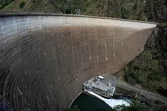 Le barrage est connu pour son déversoir libre - appelé en anglais glory-hole - d’un diamètre de 22 m au sommet et qui peut évacuer 1370 m³ d’eau à la seconde.