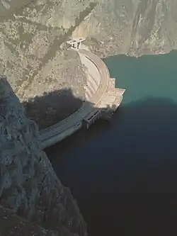 Les travaux d’infrastructure ont été importants, car le fond de la gorge étroite et profonde était difficilement accessible et contenait des rochers instables. La configuration particulière du site nécessita la construction d’une voûte épaisse de 455 000 m3 de béton pour permettre de loger l’usine au pied du barrage. Deux évacuateurs de crue sont incorporés à l’ouvrage. Quatre prises d’eau sont disposées sur le parement amont et alimentent à travers quatre conduites forcées verticales noyées dans le béton, les quatre groupes de production sous une chute de 127 m.