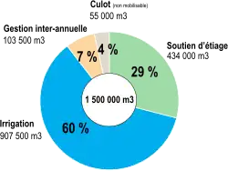 Le volume total créé par la retenue serait de 1 500 000 m3 dont 55 000 m3 de culot. Le volume disponible, de 1 445 000 m3 se répartirait comme suit : 907 500 m3 pour l'irrigation (62,8 % du volume disponible ou 60,5 % du volume total), 434 000 m3 pour la salubrité (29,0 % du volume total) et 103 500 m3 pour la gestion inter annuelle (6,9 %)[42],[43]. Le volume contractualisable pour l'irrigation est de 726 000 m3, valeur obtenue en divisant le volume stocké (907 500 m3) par le coefficient forfaitaire de 1,25[41].
