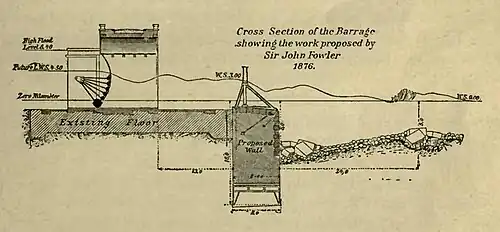 Sir John Fowler examine la structure en et la trouve plutôt de bonne qualité sauf le plancher qui doit être consolidé car pas assez profond. Il propose de ne pas abandonner le projet de barrage, mais d’utiliser les bonnes parties des structures existantes autant que possible et d’ajouter une structure supplémentaire et indépendante pour rehausser le barrage et ainsi avoir le niveau d’eau désiré (le barrage précédent semblait trop bas). Il recommande de finir les portes existantes et de les rendre opérationnelles ; de construire une rangée supplémentaire de portes avec des fondations plus profondes vingt-quatre mètres derrière pour un coût estimé à entre 1 et 1.2 million de £ (environ trente millions de francs).