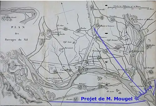 En 1842, E. Mougel arrive en Égypte pour l’aménagement du port d’Alexandrie. Il propose un barrage combiné avec une fortification (pour plaire à Méhémet Ali) en utilisant de la pouzzolane artificielle. Il se rapproche de Linant qui lui transmait tous les documents de son propre projet. Le projet est présenté au Conseil des ponts et chaussées en . Le barrage sur la branche de Rosette se constituait de trente-neuf arches et celui sur la branche de Damiette de quarante-cinq arches, toutes de huit mètres, divisées par des montants verticaux en acier en deux travées de quatre mètres de largueur. Il était prévu de maintenir le niveau d’eau à six mètres au-dessus du niveau bas des eaux. Le conseil approuve le projet mais sous réserves[2]. Méhémet Ali valide la construction d’un barrage à deux branches à l’emplacement où le Nil se sépare, ainsi le tout ne forme qu’un seul ouvrage, plus facile à contrôler et à entretenir (il s'agit de l’ouvrage encore visible de nos jours). Mais sur un sol de moins bonne qualité contrairement au projet de Linant. La branche de Rosette fut commencée en , alors que celle de Damiette se finissait sans problèmes particuliers. L’impatience du vice-roi oblige Mongel à accélérer pour ne pas être congédié, provoquant plusieurs erreurs — comme couler des fondations pendant la période haute du Nil — même s’il avait demandé plusieurs fois des reports pour couler les fondations la saison d'après ; le béton ne prenait pas ou était emporté, des fissures sont apparues sur les structures, des sources surgissaient à différents endroits.