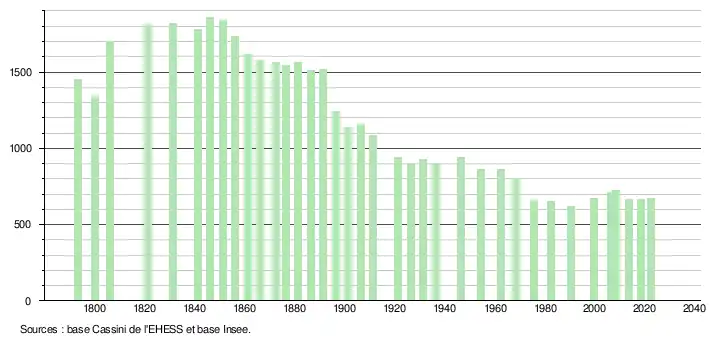 L'évolution du nombre d'habitants est connue à travers les recensements de la population effectués dans la commune depuis 1793. Pour les communes de moins de 10 000 habitants, une enquête de recensement portant sur toute la population est réalisée tous les cinq ans, les populations de référence des années intermédiaires étant quant à elles estimées par interpolation ou extrapolation[27]. Pour la commune, le premier recensement exhaustif entrant dans le cadre du nouveau dispositif a été réalisé en 2008[28].